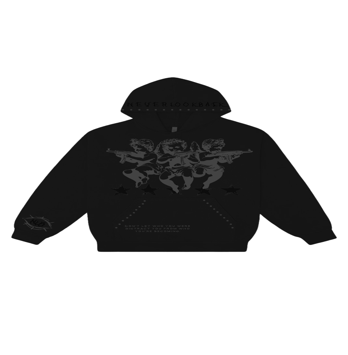 The Dangerous Angels Hoodie is crafted to make a statement. Designed with a premium heavyweight build, this piece features a bold puff print quote on the front pocket, complemented by rhinestone detailing on the hood and pocket for elevated edge. A clean embroidered logo on the sleeve finishes the look with subtle branding.